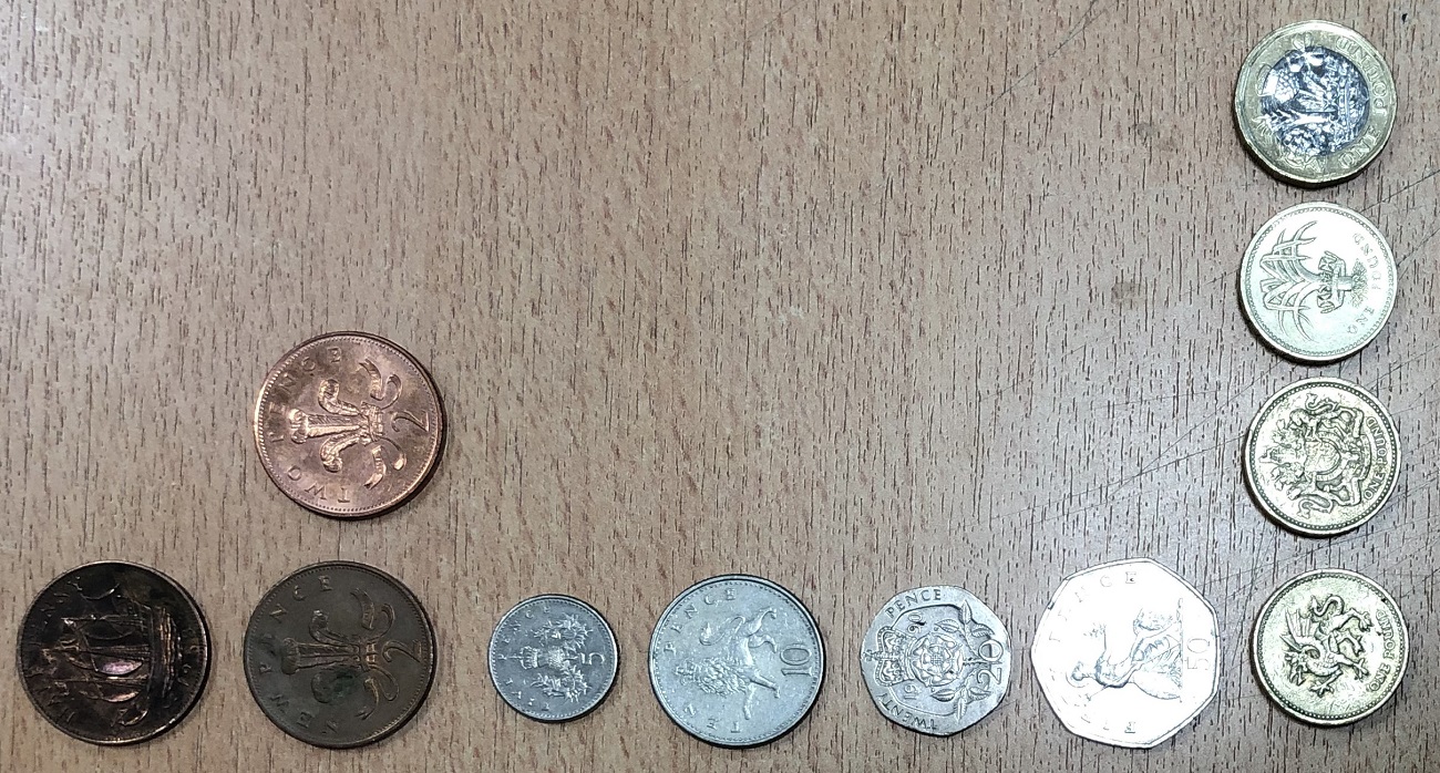 Dernière fois que j'étais au Royaume uni, j'avais beaucoup de très petites pièces (0,01 0,02 et 0,05), pour m'en débarrasser facilement, et pour éviter de me faire insulter mentalement par une caissière, j'ai utilisé le récupérateurs de monnaie dans un supermarché (il y en a chez Leclerc France par exemple) tu jettes les pièces par poignées et tu récupères un bon d'achat valable dans le magasin.