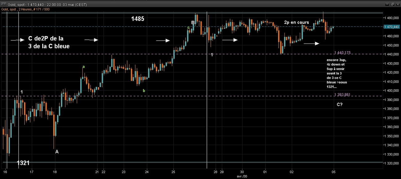 si la dernière petite c baissière a débuté le 25 avril a 1485 et qu'on est encore dans sa 2P. le point bas de la 2P en cours est pour l'instant a 1440