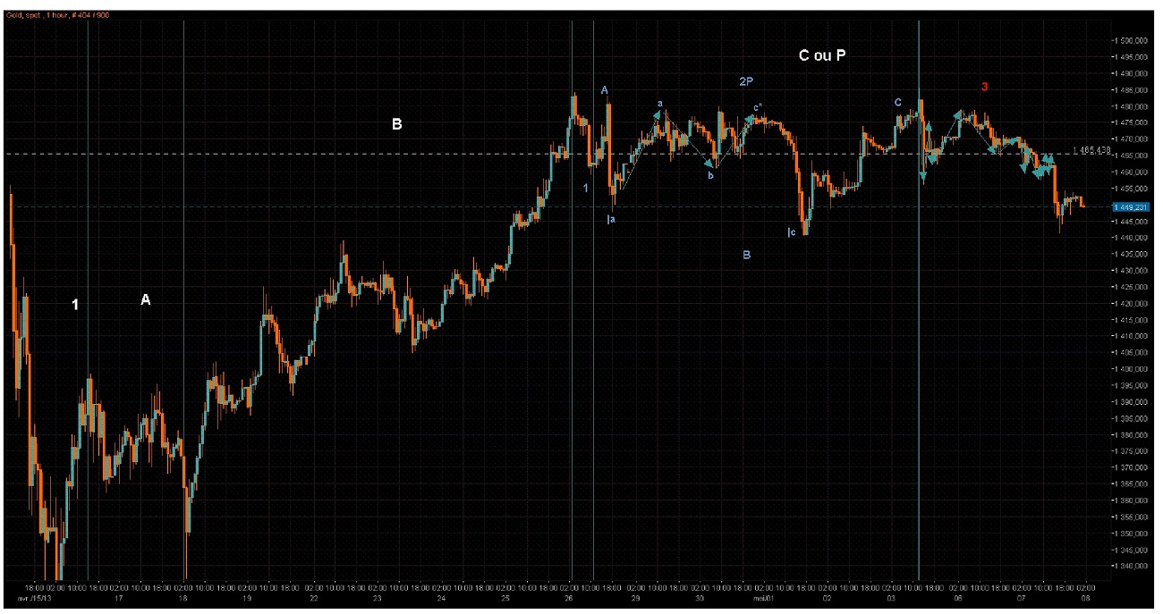Il semble que la vague 3 en décomptant depuis 1h29 soit finie il manquerait encore une Z de hausse et une baisse qui sera la 5 si on échoue sur les 1450 avec la Z
