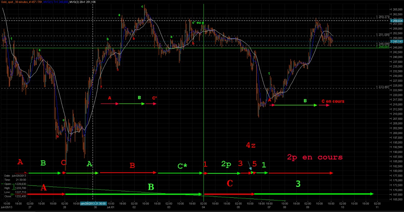La fait étant que le cours est "bloqué entre 1250 et 1245" ce qui il me semble tendrait à converger dans les deux cas pour ce qui est de la vague actuelle vers une P.