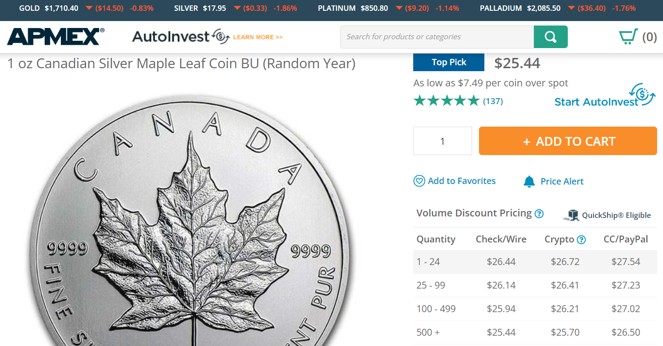 Mise à jour au 8 septembre 2022 avec un spot à 18,72$ (prix unitaire pour 20/25 onces)