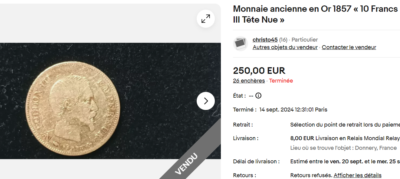 Je suis d'ailleurs étonné que Ebay ne propose pas de récolter la TMP automatiquement, comme les pros du secteur. Parce que vendre un Napo (ou toute autre pièce en or) sur Ebay France et ne pas payer la TMP, c'est un pari très risqué. Comme Bercy a accès à toutes les ventes de tous les résidents via leur numéro fiscal (directive DAC7), c'est quasiment sûr que dans les 3 ans beaucoup vont recevoir un courrier leur demandant un justificatif de versement de la TMP+ une éventuelle amende.